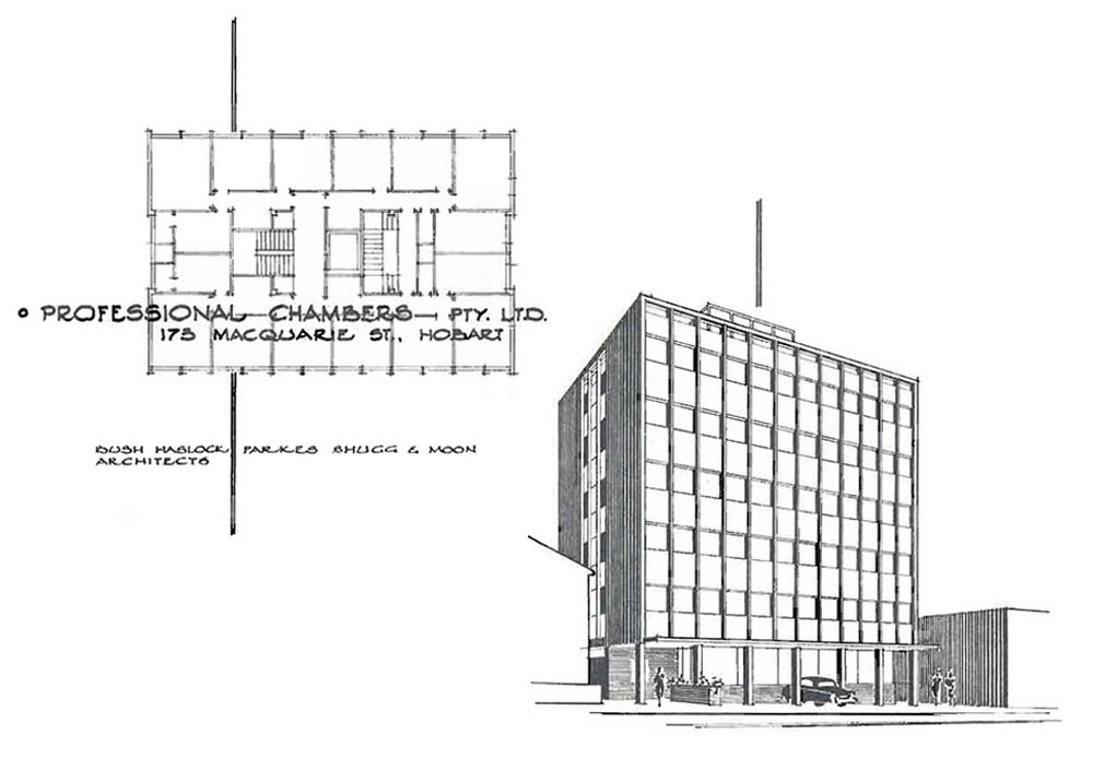 Later, in 1955, K. W. (Bill) Shugg and J. S. (Jim) Moon joined to form a partnership in Hobart, which took place shortly after Jim returned from Copenhagen where he had been gaining valuable experience. In the following year, Bush Haslock and Parkes invited Shugg and Moon to form a joint venture known as Bush Haslock Parkes Shugg and Moon, now having the capacity to handle large scale projects.